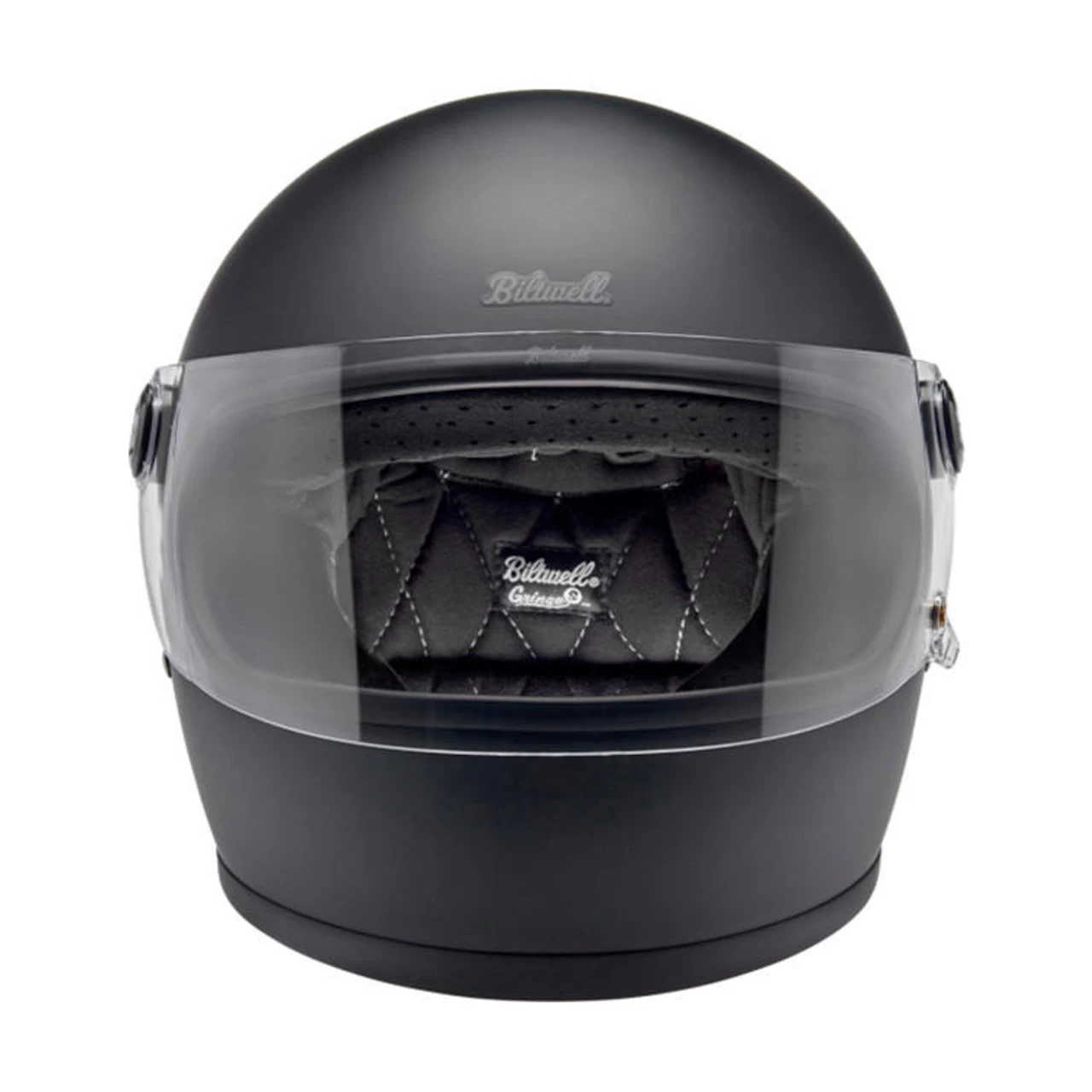 This full face motorcycle helmet is DOT certified and has an ABS outer shell and shock-absorbing EPS liner to protect riders. The liner is also hand-stitched with a diamond stitched quilted detailing. This full face helmet is comfortable and has a built in shield that reduces wind and noise, eliminates the use of a bubble shield, and keeps out rain and debris. The shield has clear optics with a snap and tab configuration to open fast and close securely. The Biltwell Gringo S helmet’s vintage style is available in multiple color options to choose from.