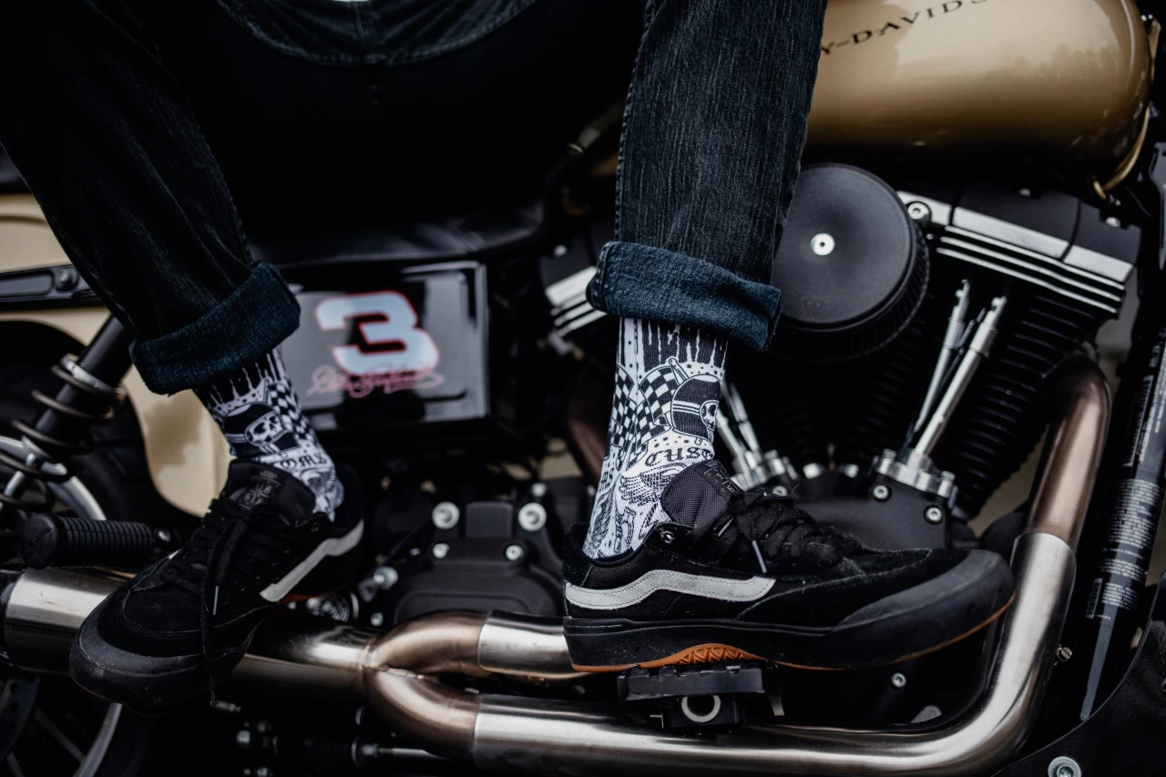 The Deadbeat Ride Fast Socks are black and white and will look good with whatever you want to wear. They are comfortable, while still allowing your feet to breathe.