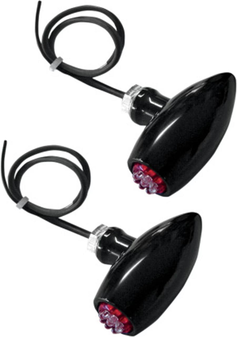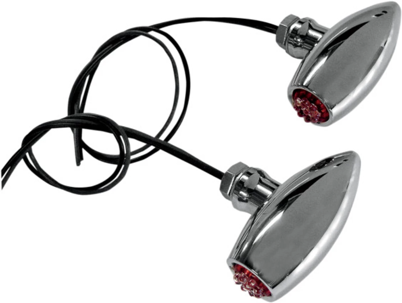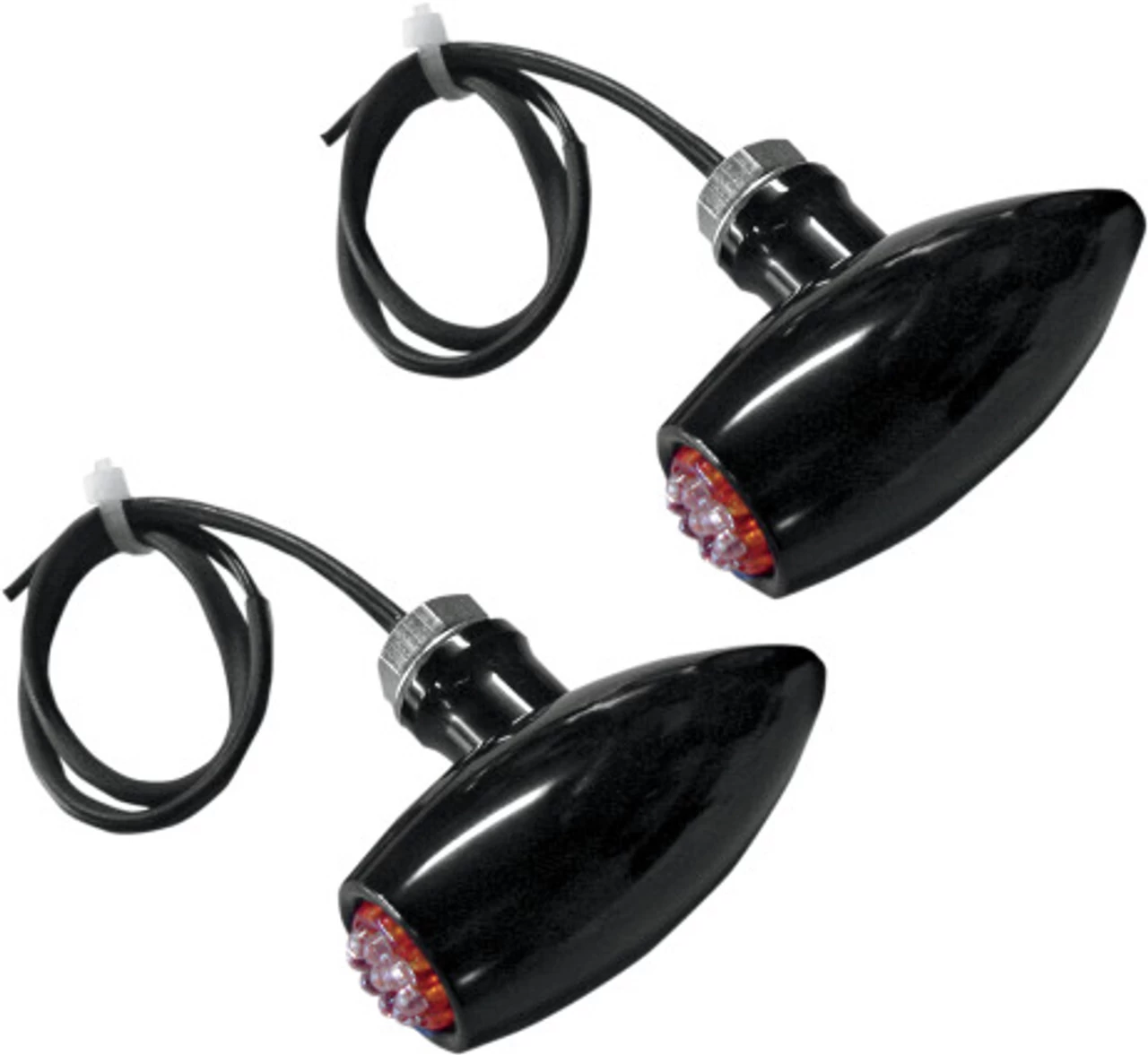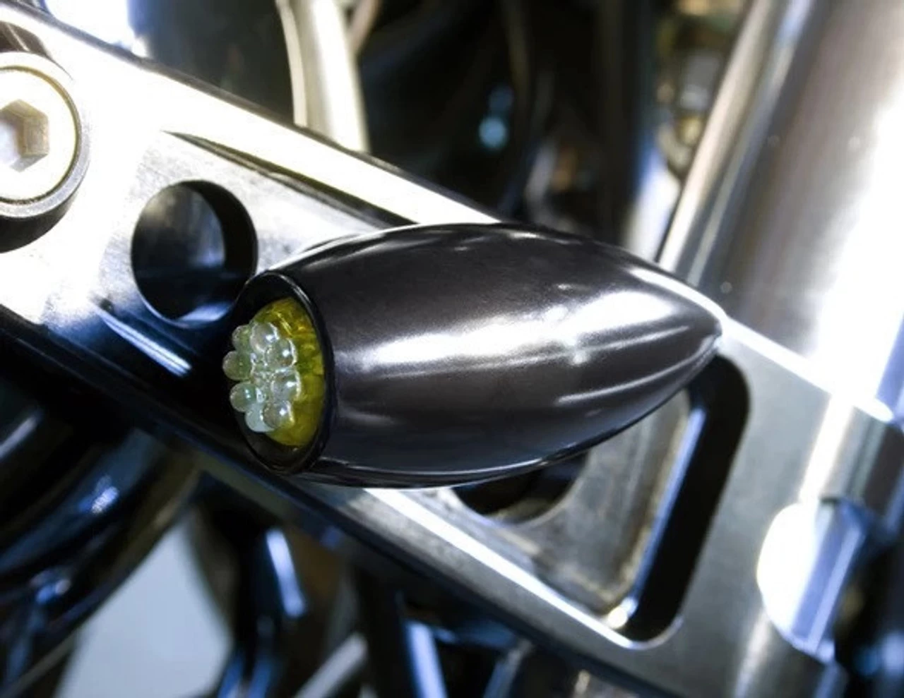 These slick bullet-style super-bright Astro LED turn signal/marker lights really clean up the look of your bike. Each features nine intensely bright LEDs in a cluster module for light output, amazing for its size. They are available in your choice of amber or red LED light color output and your choice of chrome or hard black anodized finishes.