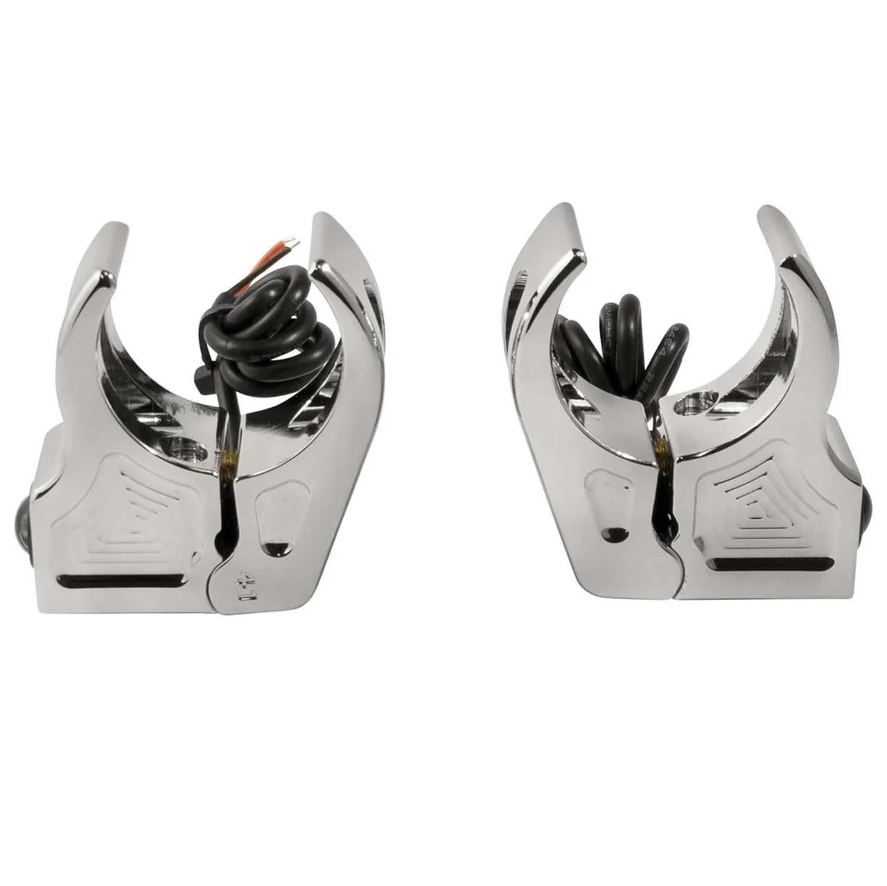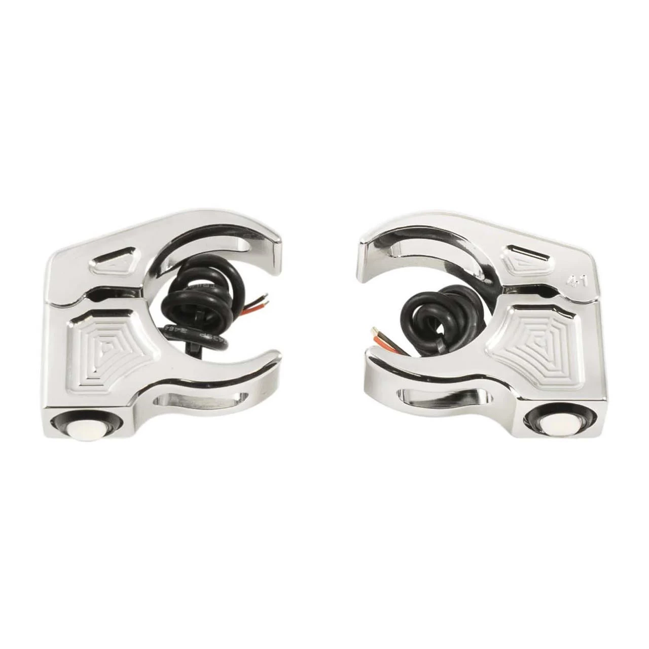 These turn signals have two-piece claw clamps which separate and mount without requiring you to drop your fork tubes. Their small, simple but powerful aluminum shape gives the lights a low-profile look. They come with lots of wiring if you want to mount them above the lower triple tree.