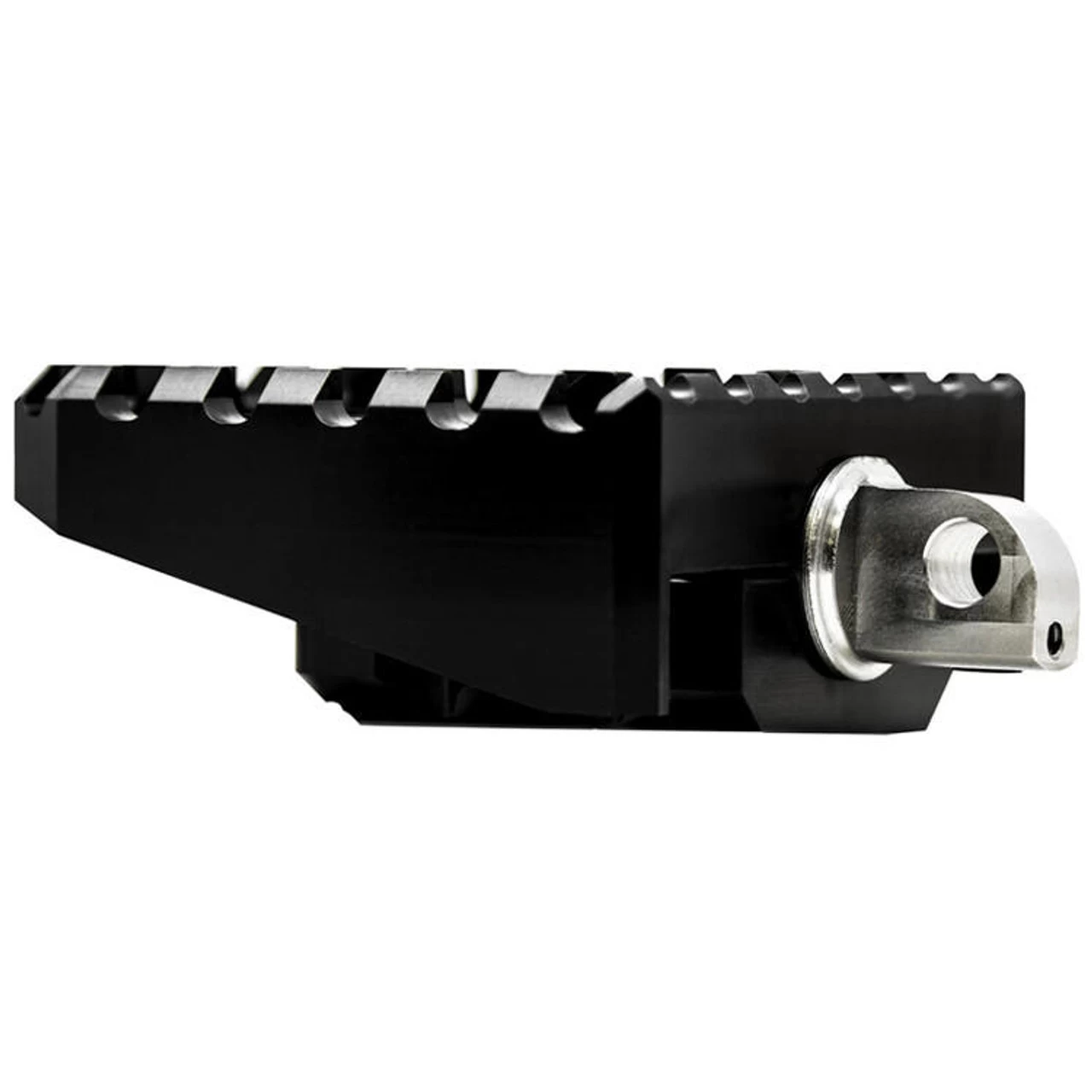 Heavy duty mini floorboards with stainless steel knurled spindle with a stainless steel clevis. Clamping design eliminates any spinning or movement of floor boards under any conditions. Made of 6061 aluminum, CNC cut and anodized black finish only.