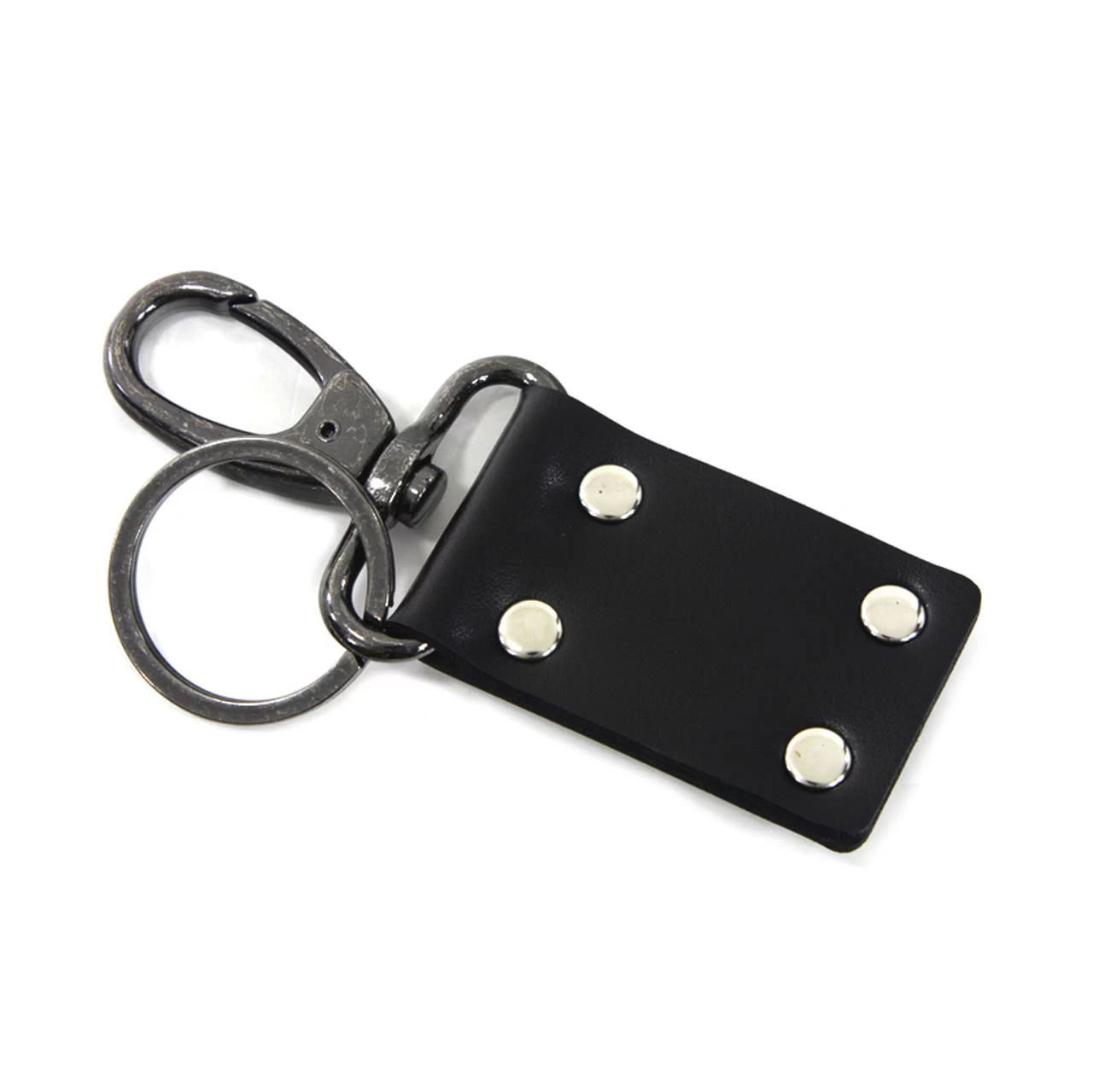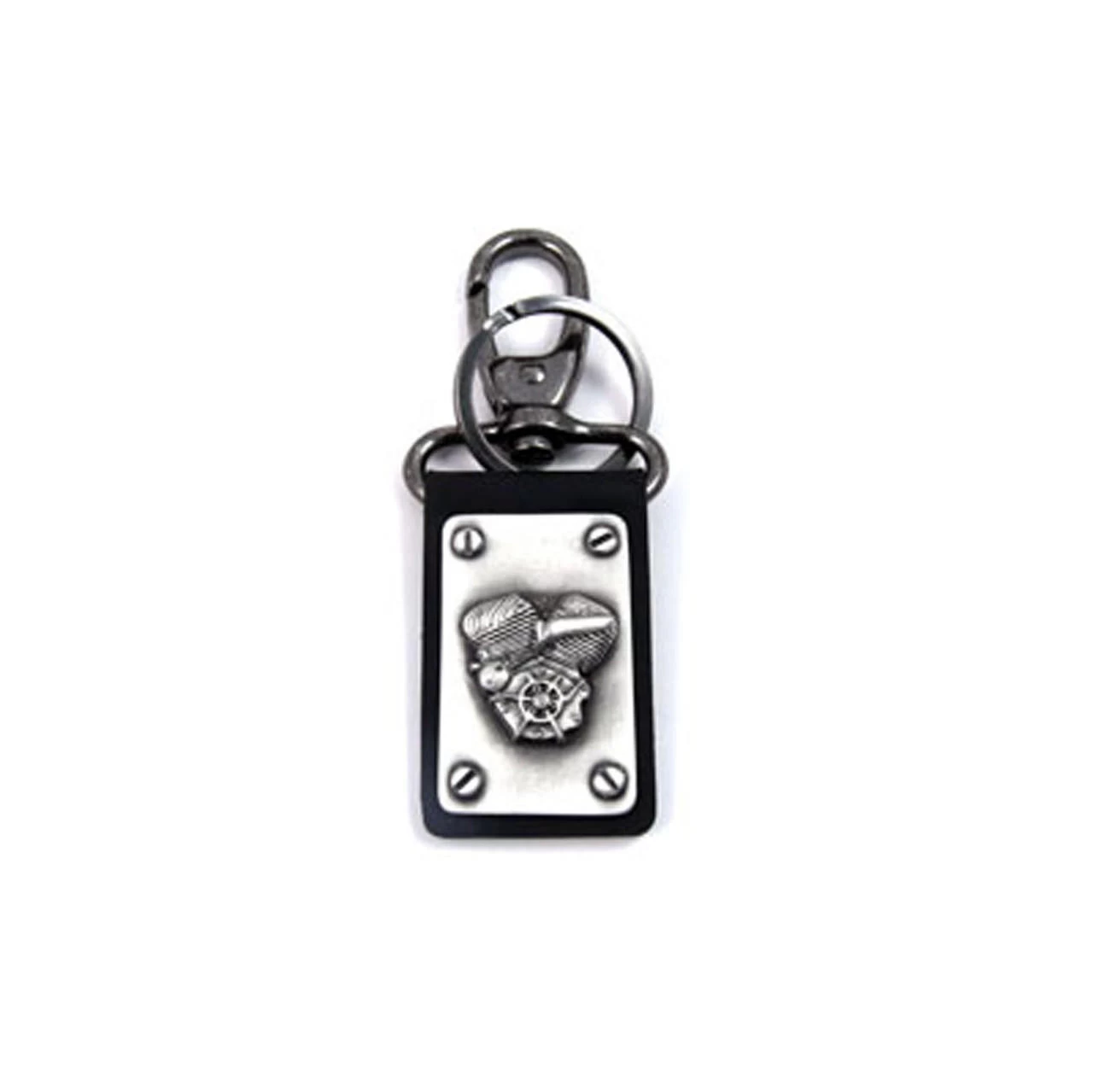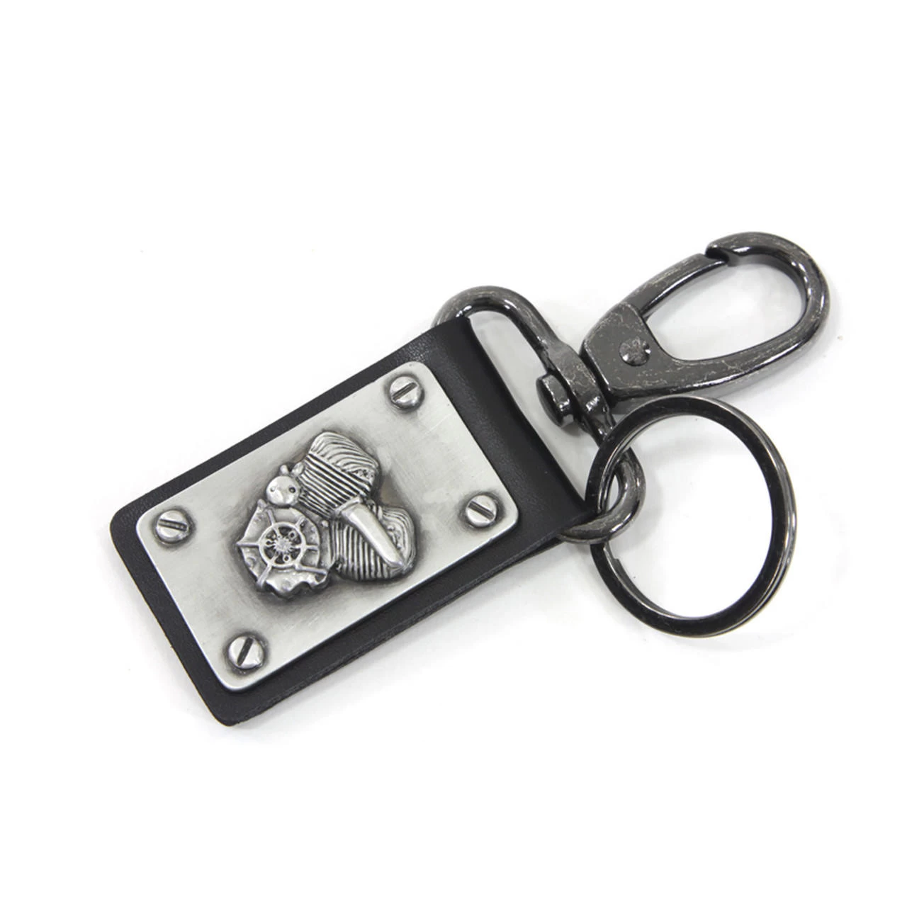 This is a flathead style motor keychain with a silver patina finish. It features a motor design that’s riveted in each corner to the leather backing.