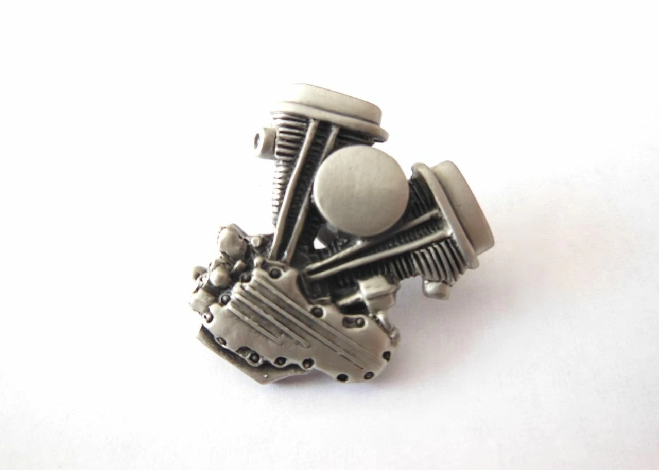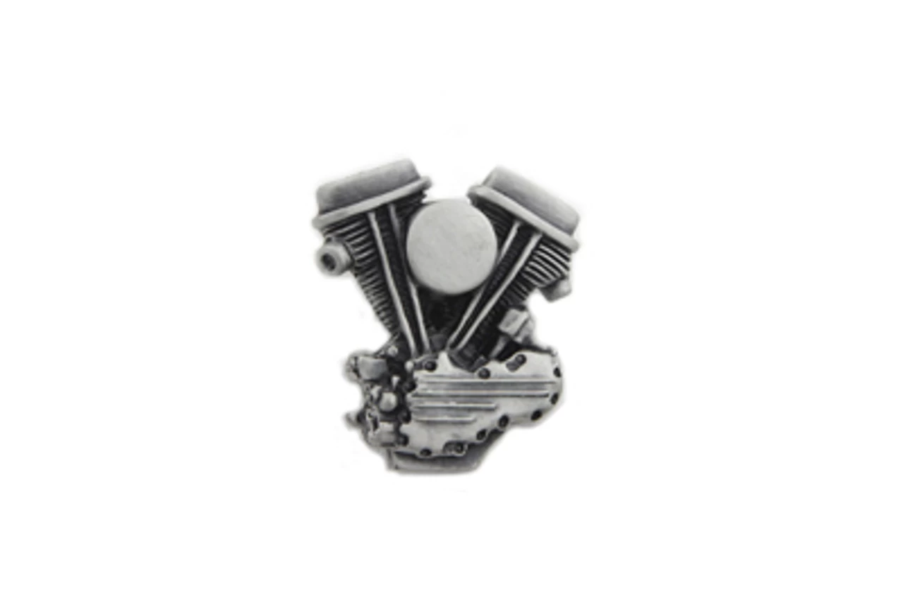 Harley Davidson Panhead lapel pin with a stick pin clasp, silver patina.